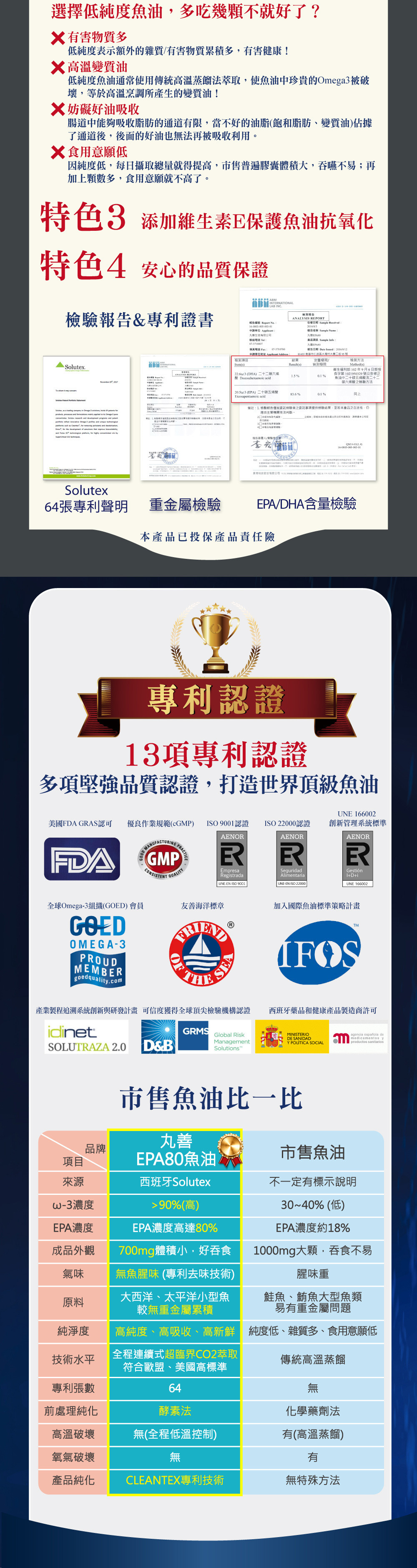 安心的品質保證 13項專利認證 多項堅強品質認證,打造世界頂級魚油
