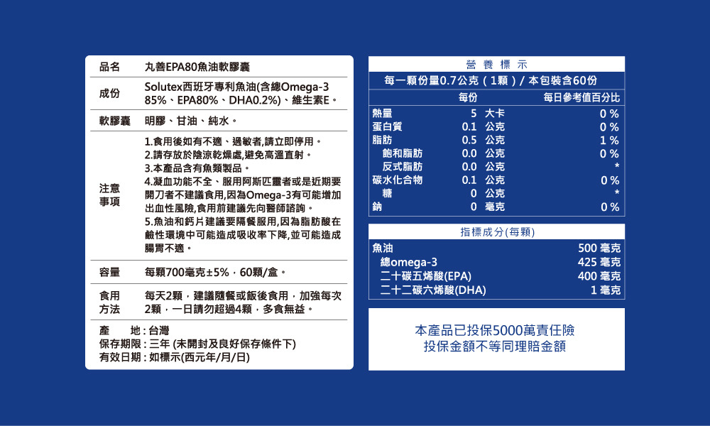 【心悅保健】魚油軟膠囊EPA80/60顆/盒 每一份量1顆(0.7公克) 本包装含60份 容量:每顆700毫克,60顆/盒 食用方法:每日2次,每次1顆,加強每次 2顆,早晚飯後搭配開水使用, 一日請勿超過4顆,多食無益。 保存期限:三年(未開封及良好保存條件下) 有效日期:如標示(西元年/月/日) 產地:台灣